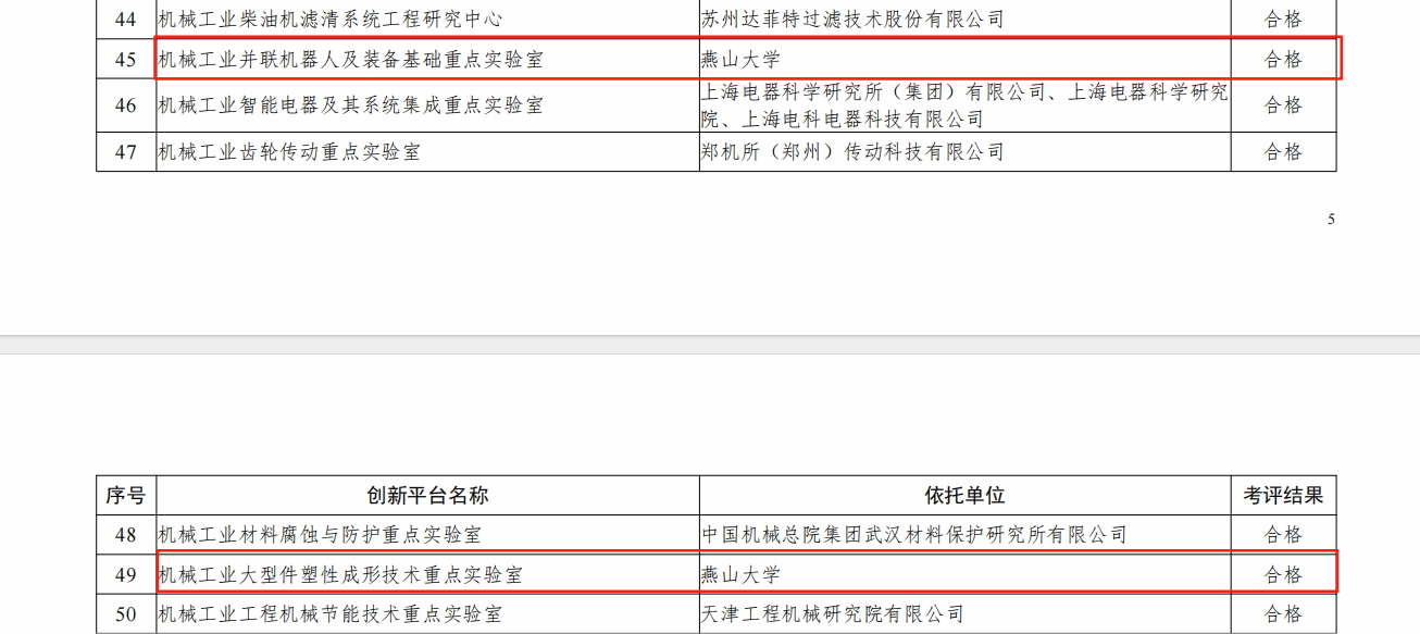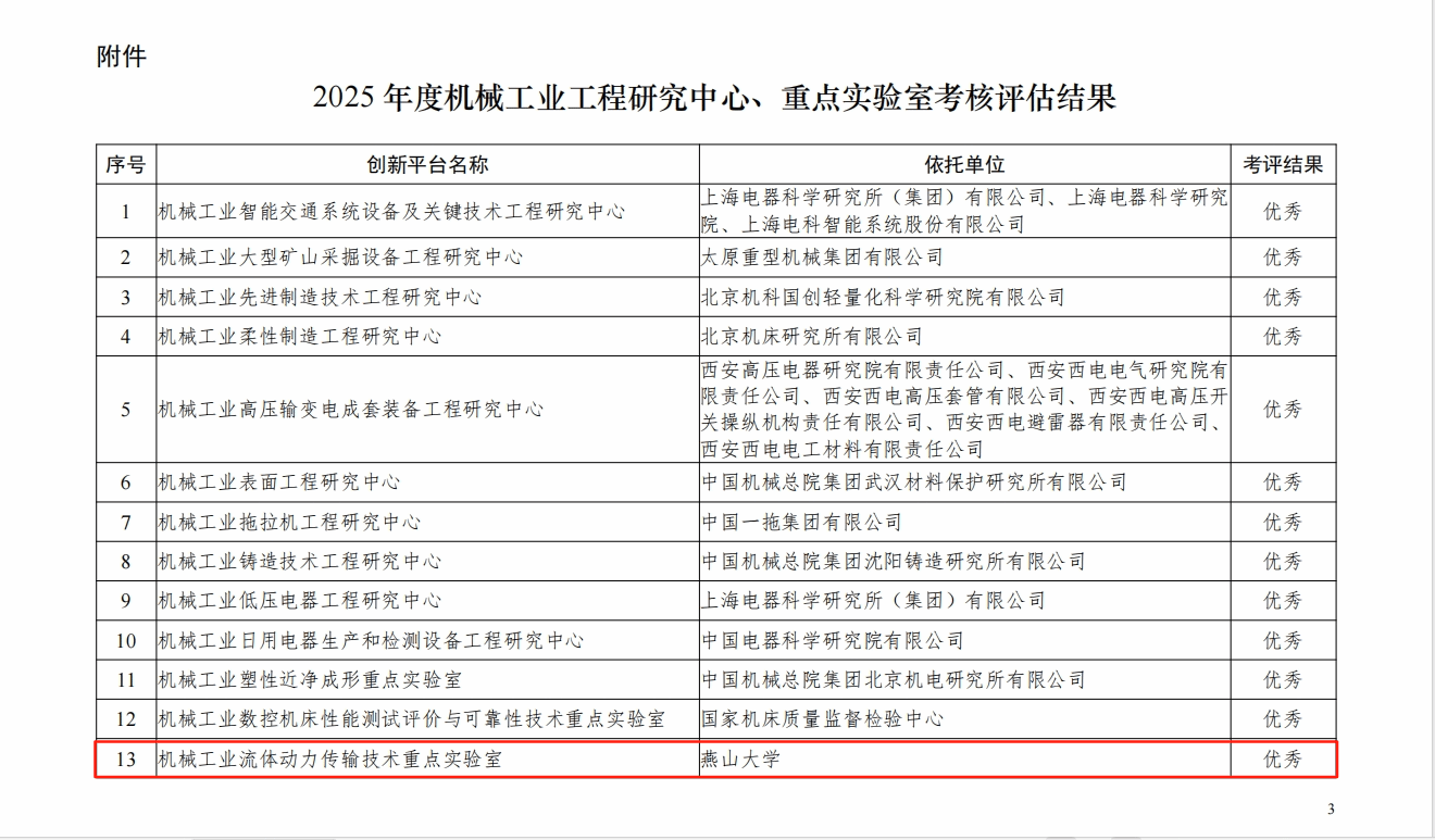 近日,中国机械工业联合会发布了2025年度机械工业工程研究中心、重点实验室考核评估结果,依托燕山大学建设的机械工业流体动力传输技术重点实验室、机械工业大型件塑性成形技术重点实验室和机械工业并联机器人及装备基础重点实验室三个重点实验室均顺利通过考核,其中机械工业流体动力传输技术重点实验室获评优秀。