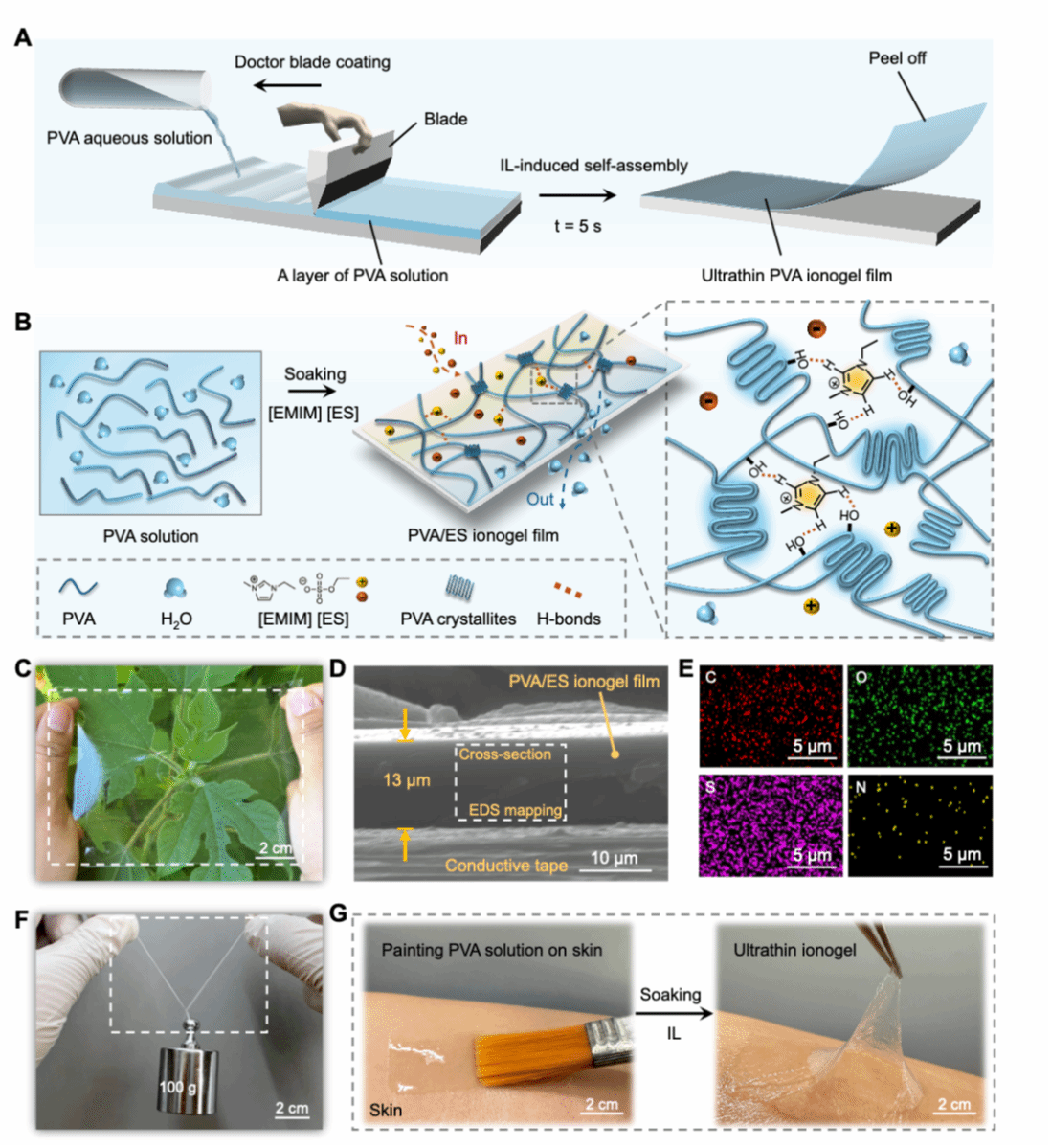 在动态机械形变下能够保持可靠性能的可拉伸电子器件,已广泛应用于贴肤电子、人机交互和软体机器人等领域。为满足实际应用需求,尤其是贴肤应用器件所用柔性材料,需同时具备机械鲁棒性、可靠的共形贴合能力、良好导电性以及优异的环境稳定性。离子凝胶膜因具备仿生离子导电特性、优异的机械柔顺性和高稳定性,被认为是下一代柔性电子的重要软材料。然而,尽管已有多种制备策略报道,如何实现快速且可规模化制备超薄离子凝胶膜,并同时集成上述关键性能,仍是限制可拉伸电子器件发展的重要难题。基于此,团队采用简单的“刮刀涂覆—浸泡”工艺,使高粘PVA水溶液与IL接触后在5s内自发形成致密的非共价交联网络,快速转化为可剥离的超薄离子凝胶膜,所得超薄离子凝胶膜在“薄”的同时兼顾力学与导电性。基于独特的制备方式与优异性能,该离子凝胶膜可通过“涂覆PVA溶液—浸泡离子液体”的方式,便捷加工为皮肤生物电子器件,在皮肤表面形成出色的共形贴合与持久接触,实现多种电生理信号(如ECG与EMG)的高保真采集。此外,以该离子凝胶膜作为可拉伸基底,还可通过3D打印技术制备集成电路与多通道电极阵列,并表现出较高的柔性与可靠性。此外,所提出的IL诱导自组装策略具有普适性,可拓展至不同离子液体体系,构建力学性能可调的超薄离子凝胶膜。本研究为快速制备具有高强度与高级功能的超薄离子凝胶膜提供了新思路,具备在可拉伸电子领域的广阔应用潜力。