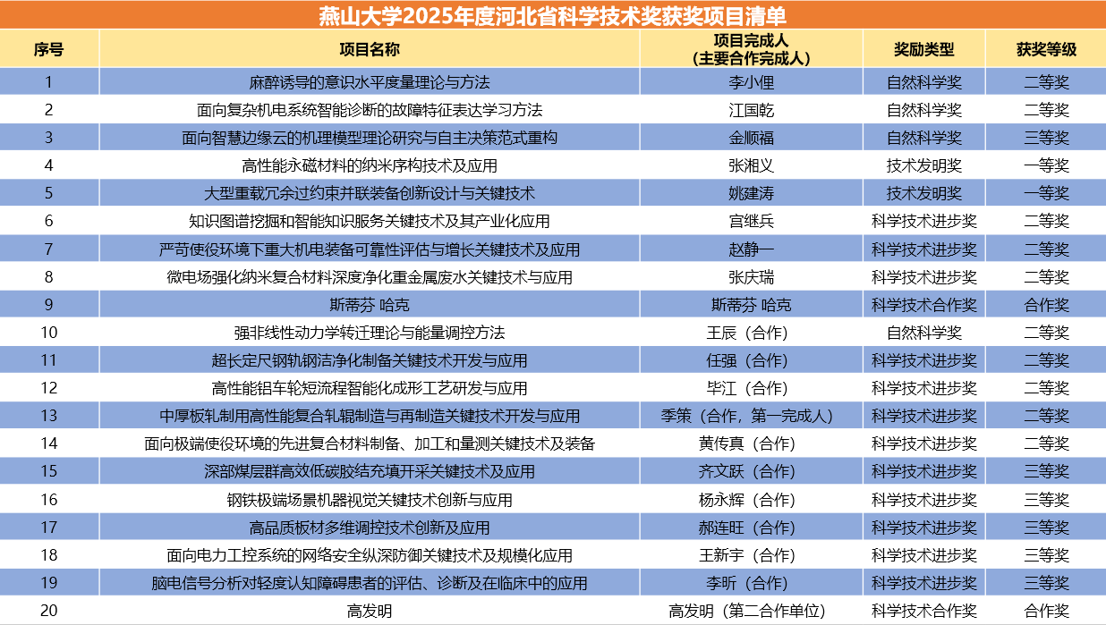 学校科学技术研究院、亚稳材料全国重点实验室、起重机械关键技术全国重点实验室相关负责人和2025年度河北省科学技术奖主持项目负责人在秦皇岛分会场参加河北省科学技术奖励大会。