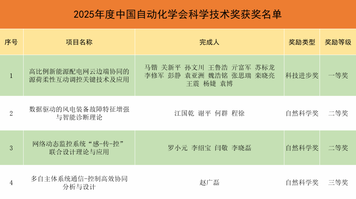据悉,中国自动化学会(CAA)是我国自动化及相关技术领域的权威学术团体,也是国内最早的国家一级学术组织之一。中国自动化学会科学技术奖是自动化领域有重大影响力的科技奖项,也是可推荐申报国家科学技术奖的重要渠道。2025年度中国自动化学会科学技术奖共评出技术发明奖10项、自然科学奖50项、科技进步奖62项、青年科技奖22人。